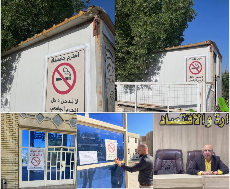 بناءً على توجيهات وزارة التعليم العالي والبحث العلمي الخاصة بمنع التدخين داخل الحرم الجامعي اقامت كلية الادارة والاقتصاد شعبة الانشطه الطلابية حملة تثقيفيه تضمنت اقامة ورش عمل حول مضار التدخين واثارها السلبيه على الصحة والمجتمع وطباعة بوسترات تثقيفه تبين اضرار التدخين.