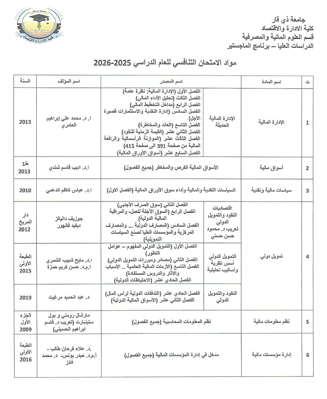تعلن كلية الإدارة والاقتصاد عن تحديد المواد المنهجية الخاصة بالامتحان التنافسي للمتقدمين لبرنامج الماجستير لقسم العلوم المالية والمصرفية للعام الدراسي المقبل 2026-2027